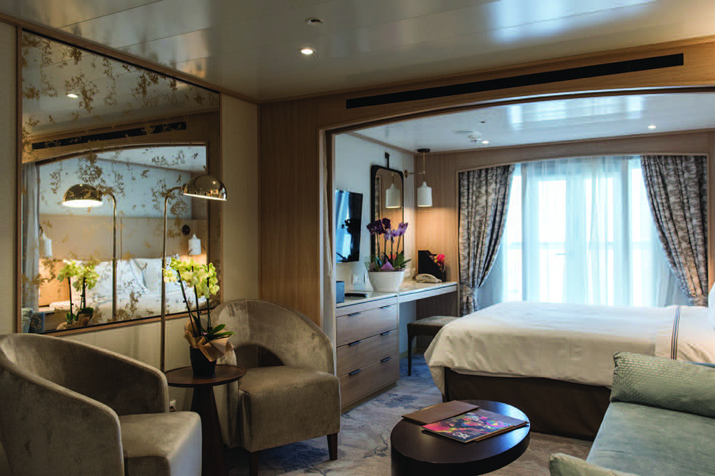 All accommodations are spacious suites, most coming in at just under 300 sq ft. Some have windows, ours had a Juliet balcony, and a few expansive Owners suites offer more overall room and spacious balconies. The new suites have the bed by the window or balcony, whereas the bed is closer to the bathroom in the original suites – some of which also have a tub rather than just a shower. The new rooms have ample electrical outlets for both European and US plugs and charging ports. A mini-fridge, which, if you have the beverage package, will be filled and replenished as required.
