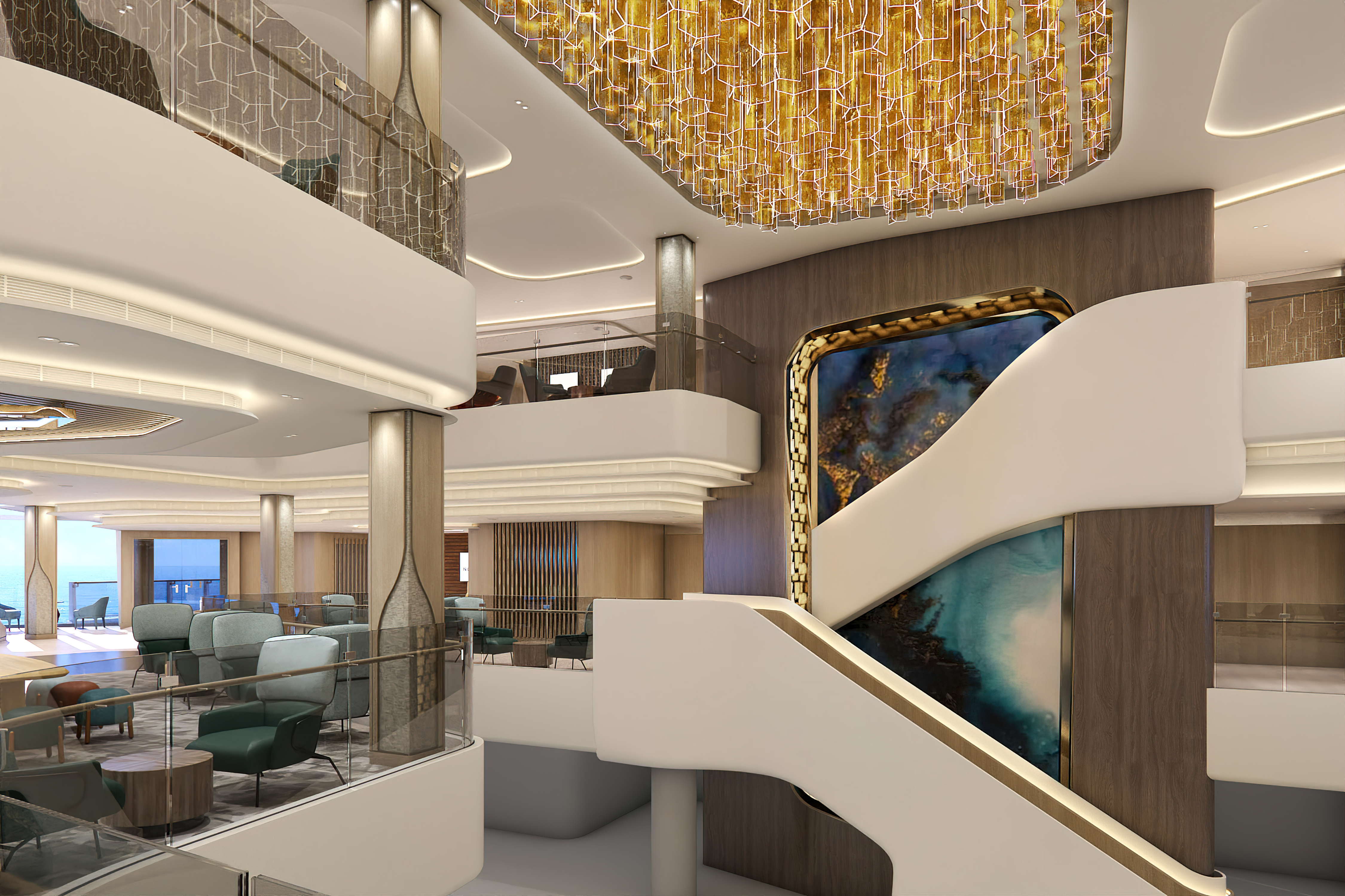 On the exterior, Aqua’s pool area on Deck 17 has been enhanced with upgraded loungers and double daybeds. Deck 18 to 20 aft is home to the outdoor family areas, starting with the 12-hole Tee Time mini-golf course themed with various world locales. A new Glow Court has an LED floor that projects various sports court layouts for gameplay, and holds dance parties at night. High atop Deck 20, the three-story Aqua Slidecoaster takes centre stage as Aqua’s feature water attraction. The hybrid rollercoaster and waterslide is the first of its kind at sea, sending single or double riders through a covered tunnel, which has a clear section for that well-timed photo of a rider swooshing by. Family fun continues in the Aqua Game Zone arcade on Deck 17, formerly Galaxy Pavilion. The space is designed for spectating as well as gameplay,
