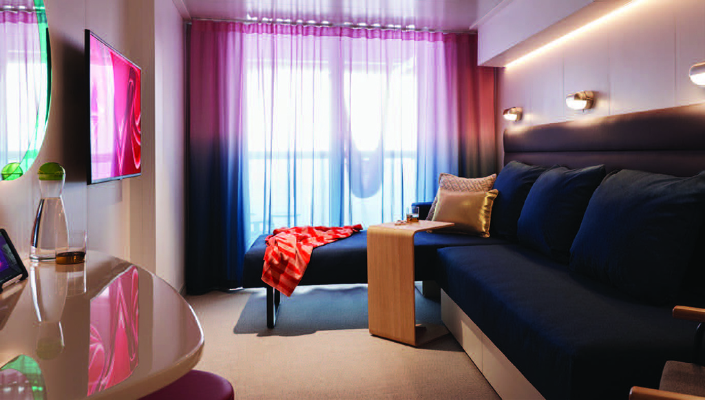 Innovations continue in Scarlet Lady’s accommodations. The transformable seabed can be made into a sofa by day that is much more conducive to lounging or socializing with friends. Trendy features such as mood matching lights, music selection, and automatic curtains are controlled through the in-room tablet.