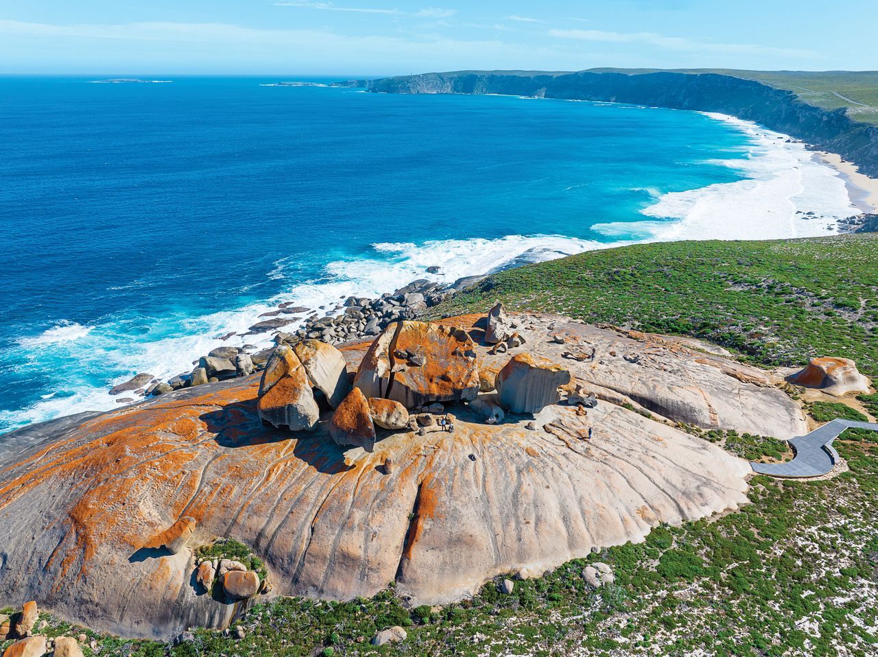 Beyond all this abundant wildlife, KI is also renowned for its staggering vistas, geological oddities and ancient natural history. The u-shaped beach at Vivonne Bay Conservation Park is consistently voted one of Australia’s most scenic. Six kms of soft, white sand stretch out to crystal-clear turquoise waters, while wallabies graze in the nearby dunes and eagles soar overhead. A variety of trails take you deeper into this quiet coastal scene. The postcard views continue a half-hour down the road at the 250-square-hectare Flinders Chase National Park. The Remarkable Rocks are indeed remarkable, granite formations shaped by the elements over the past 550 million years. The orange and red lichen glows best at sunrise and sunset.
