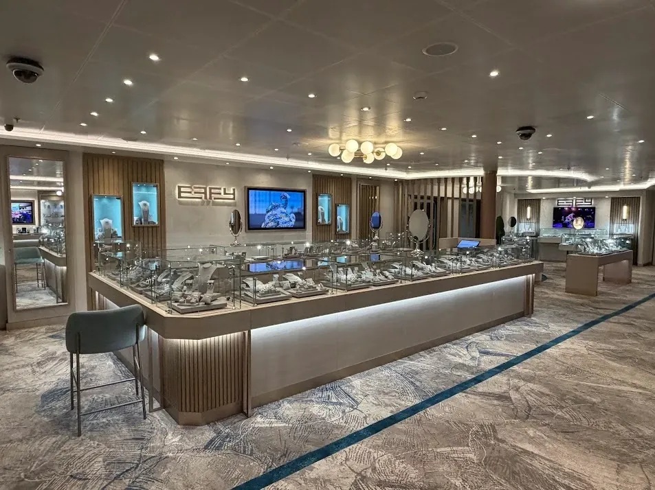 The refreshed venue features comfortable lounge seating that encourages conversation and extended engagement with Effy jewelry experts. Private consultation nooks add an extra layer of exclusivity, creating a refined setting where guests can select luxury souvenirs from their voyage.