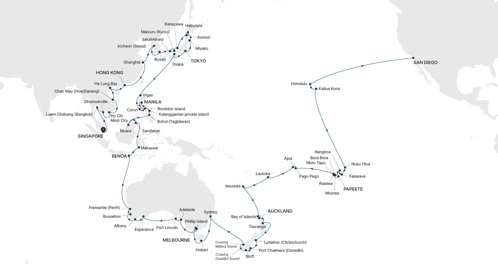 THE WILD & THE WORLDLY – Auckland, New Zealand to Melbourne, Australia (February 11 -February 27): A journey into the duality of the Pacific, this chapter from Auckland to Melbourne captures how the region blends its glacier‑carved wilderness with the cultural energy of cosmopolitan cities. Guests will encounter dramatic fjords, remote coastal landscapes, and heritage‑rich port towns before transitioning into vibrant urban centers.