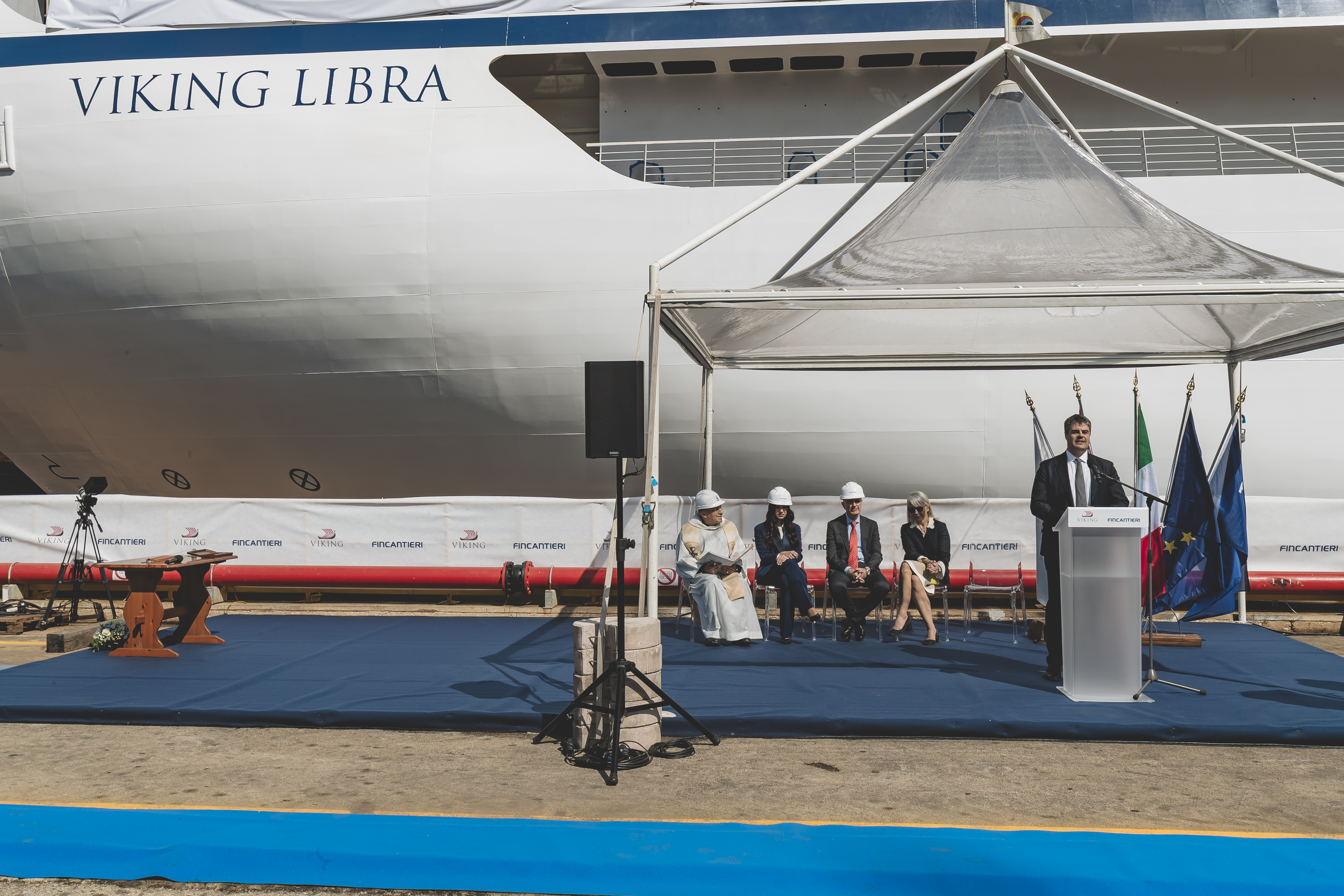 The float out ceremony took place at Fincantieri’s Ancona Shipyard and is significant because it denotes a ship moving into its final stage of construction. The float out of the Viking Libra began when a ceremonial cord was cut that signaled water to flow into the ship’s building dock. Following a two-day process that will set the Viking Libra afloat, she will then be moved to a nearby outfitting dock for final construction and interior build-out. The ceremony was attended by Fincantieri’s Gilberto Tobaldi, Director of the Ancona Shipyard, as well as members of the Viking team, including Karine Hagen, Executive Vice President of Product, and Enrico Prunotto, Senior Vice President of Ocean Passenger Operations, who thanked the shipyard on behalf of Viking.
